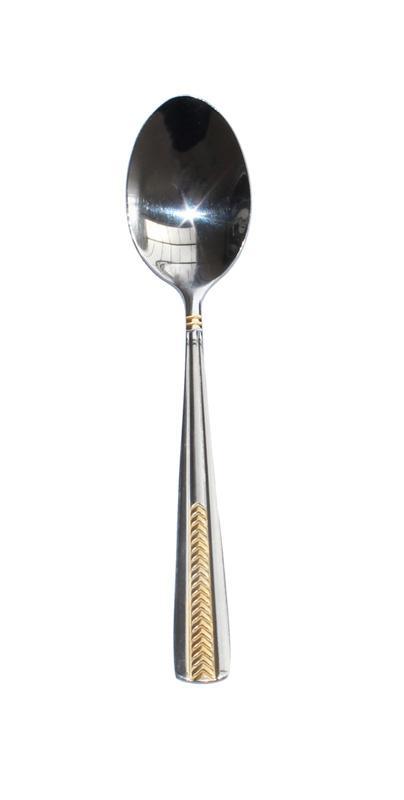 Набір 6 чайних ложок "Золотий колосок". Класичний дизайн з золотим покриттям ручки і об'ємним декором. Чайні ложки з нержавіючої стали не фарбуються і не вбирають запахи. Зберігають блиск протягом довго часу. Розмір - 14см, робоча поверхня - 4см. У наборі 6 ложечок.